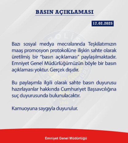 “Bazı sosyal medya mecralarında Teşkilatımızın maaş promosyon protokolüne ilişkin sahte olarak üretilmiş bir “basın açıklaması” paylaşılmaktadır. Emniyet Genel Müdürlüğümüzün böyle bir basın açıklaması yoktur. Gerçek dışıdır.